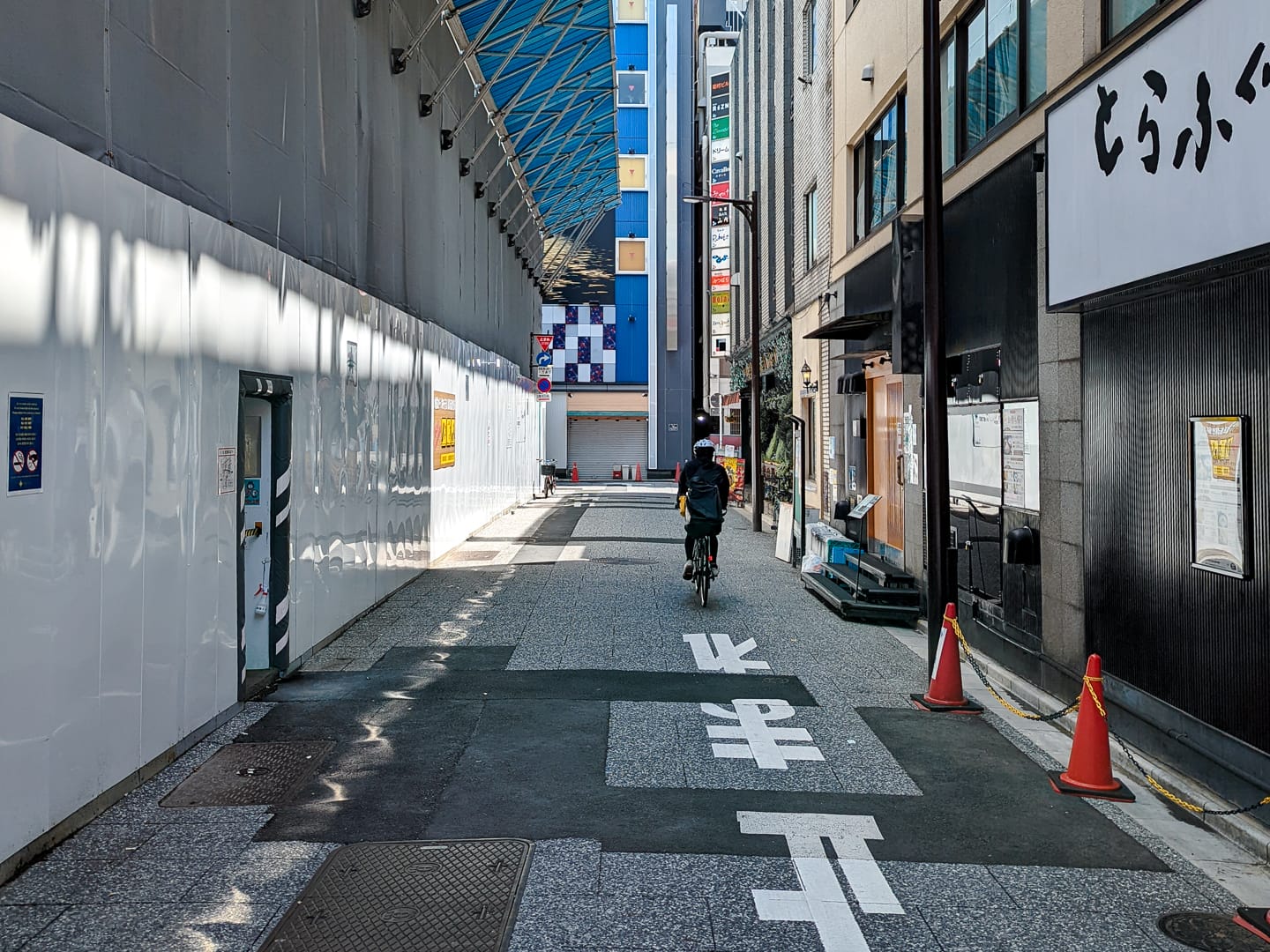 A cyclist manoeuvres through a side street off Ginza Corridor, a lengthy under-track passage on the western perimeter of Ginza lined with bars, cafés, and restaurants that share an expressway for a roof. There is much to say about Ginza Corridor. Still, this side street leads away into the elongated 7-Chōme portion of Ginza, which reaches southeast toward the Sumida River, almost reaching Tsukijishijō Station, near the old site of Tsukiji Fish Market.